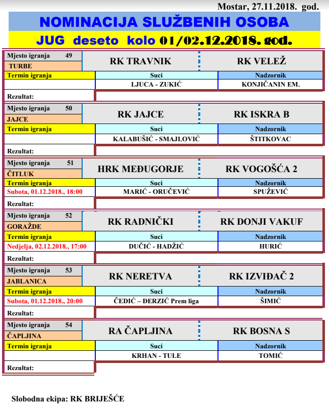 Nominacija službenih lica za 10. kolo lige Jug za muškarce