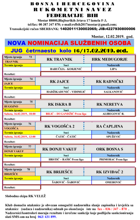 Nominacije službenih lica 14. kola lige Jug za muškarce
