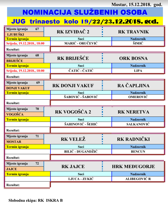 Nominacije službenih lica za 13. kolo lige Jug za muškarce