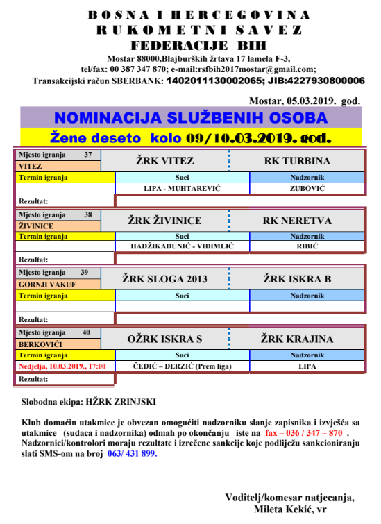 Nominacije službenih osoba 10. kola za žene