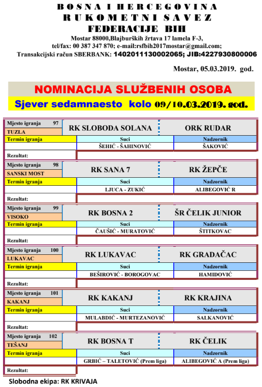 Nominacije službenih osoba 17. kola lige Sjever za muškarce