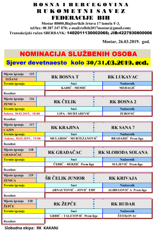 Nominacije službenih osoba 20. kola lige Sjever za muškarce