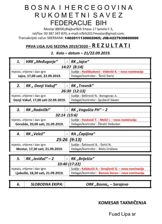 Rezultati 1. kola – Liga Jug