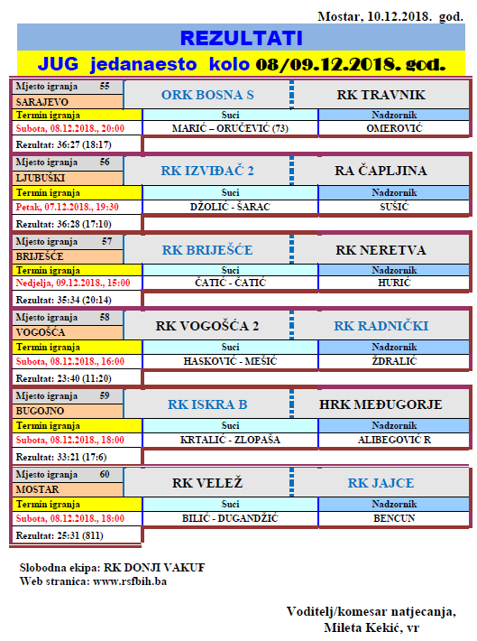 Rezultati 11. kola lige Jug za muškarce